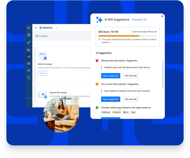 Optimizes:Each item receives an SEO score with clear, prioritized recommendations, optional and fully controlled by you.