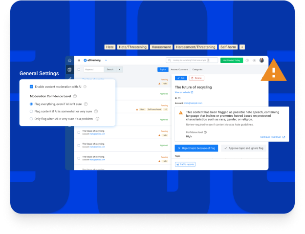 Monitors:Flagged content is held for admin review, moderation strictness is fully configurable.